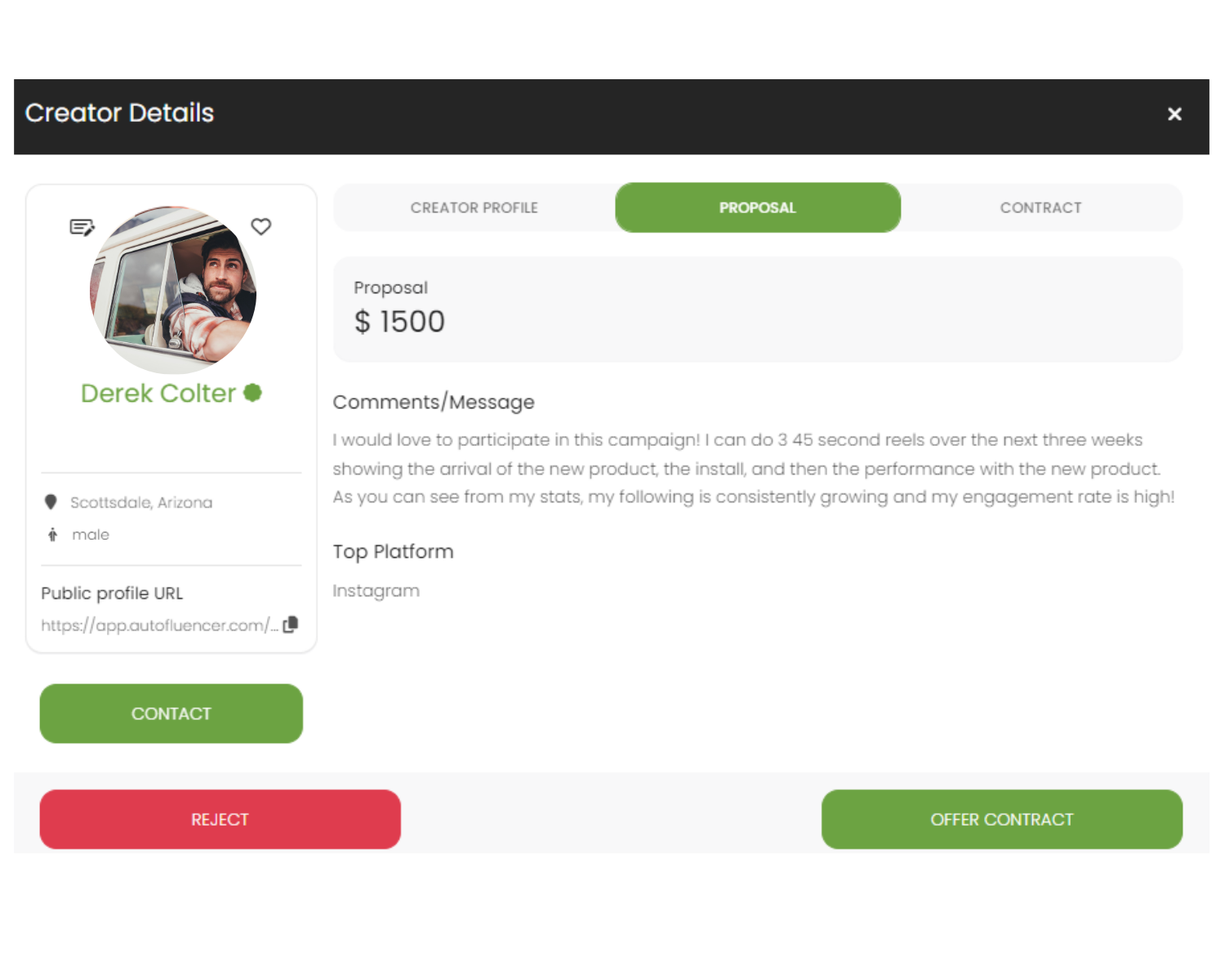 Autofluencer streamlines the collaboration process with in-app proposals, brand messaging, and agreements. For active partnerships, Autofluencer will remind you when deliverables are due and update the brand as you post content live.