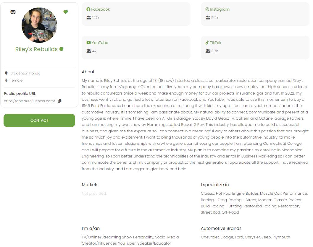 Autofluencer makes it easy to find brands searching for creator partners and with your Dynamic Creator Profile, it's easy for brands to find you! These profiles keep your social stats up to date while enabling you to highlight your unique value propositions and specialties.